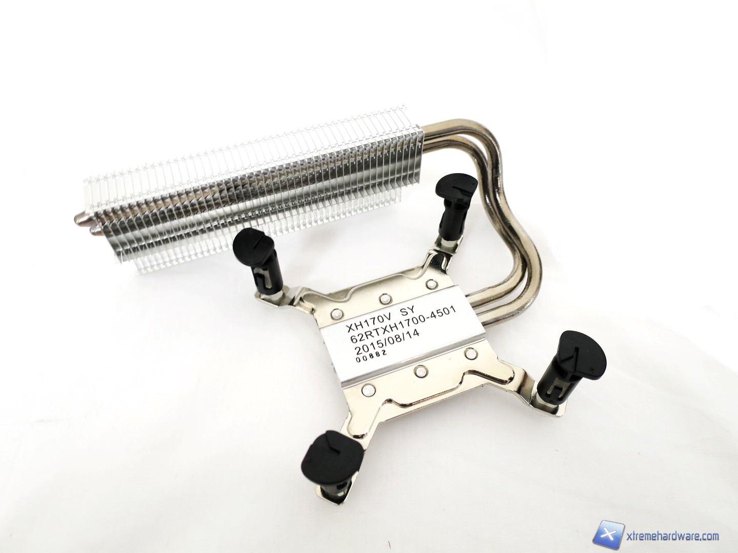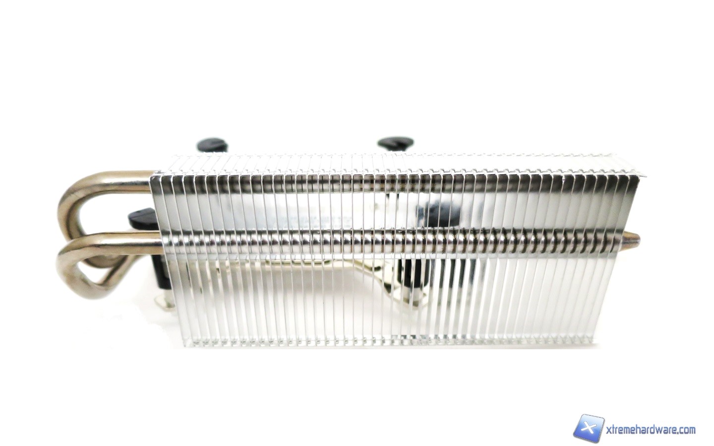Rimuoviamo ora il dissipatore per dare uno sguardo anche a quest’ultimo. Esso prevede sistema di montaggio Push Pin tipico dei dissipatori Stock di Intel o di altri Aftermarket di medie prestazioni. E’ dotato di un corpo in alluminio nickelato e di due heat pipes HDT che escono dal lato destro per terminare in un corpo lamellare di discrete dimensioni. Qualità e cura per i materiali buona per un sistema votato più che altro alla multimedialità e all’utilizzo office.