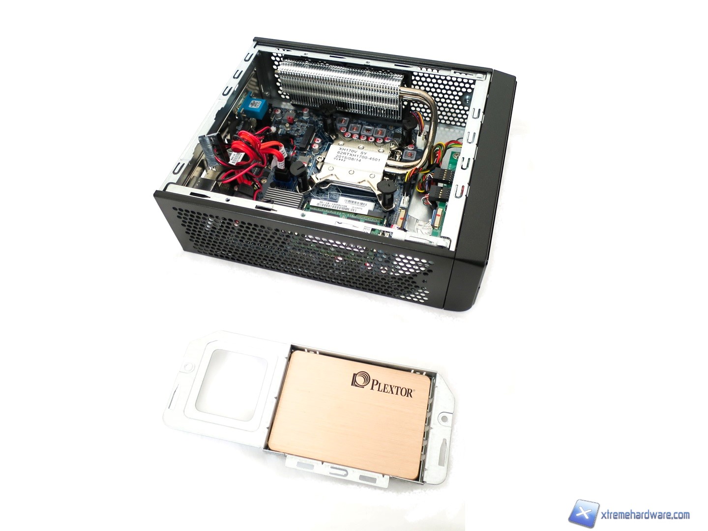 Spostando i cavi e connettori SATA per le unità possiamo scorgere meglio lo slot PCI-Express poc’anzi citato nonché la presenza di un Heatsink per il PCH H170 vicino allo slot per gli SSD M.2. Questo è compatibile con SSD fino al comune formato 2280 (80 mm di lunghezza). Avremo dunque la possibilità di utilizzare SSD M.2 rispetto ad uno classico SATA da 2,5”, riducendo gli ingombri all’interno del Mini-PC.