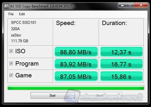 AS SSD Benchmark è un'altro benchmark gratuito studiato appositamente per SSD. Effettua i suoi test sintetici senza adoperare la cache del sistema operativo che va ad influenzare pesantemente i risultati del Transfer Rate, inoltre determina i tempi di accesso del drive sfruttando l'intera capacità del drive stesso. Tutti i test vengono effettuati utilizzando dati non comprimibili.