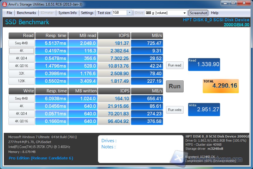 Per terminare il round dei test su questo controller RocketCache ci siamo affidati alla suite Anvil's dedicata esclusivamente al benchkmarking e verifica degli SSD. Confermate anche in questo caso le ottime prestazioni verificate nei software precedenti e decretando di fatto tale modalità la migliore se si cercano le prestazioni pure.